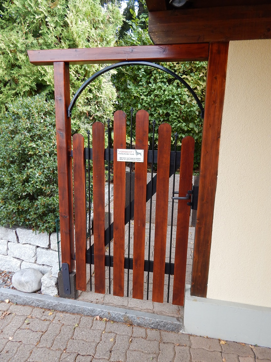 Eingezäuntes Grundstück mit entsprechend hohem Zaun und Tore nach innen öffnend. Tore mit 1 Meter Höhe werden von Dobermännern locker übersprungen, wenn sich auf der anderen Seite etwas interessantes zeigt.